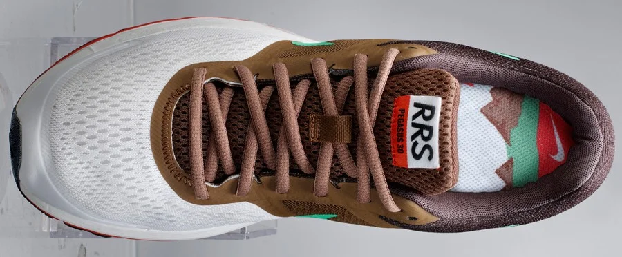 Inspired by the Bear Flag of the California Republic, the Pegasus was colored with the flag’s red, white, and green colors throughout. The brown of the flag’s grizzly bear – “Monarch,” who lived at San Francisco’s Woodwards Gardens before moving to the zoo at Golden Gate Park in the early 1900s – dominated the Hyperfuse paneling, mesh tongue and Engineered Mesh heel of the shoe’s upper. A final Road Runner Sports touch comes in the form of “RRS” branding across the tongue, and a custom sockliner graphic was reminiscent of Nike Running graphics from the past.